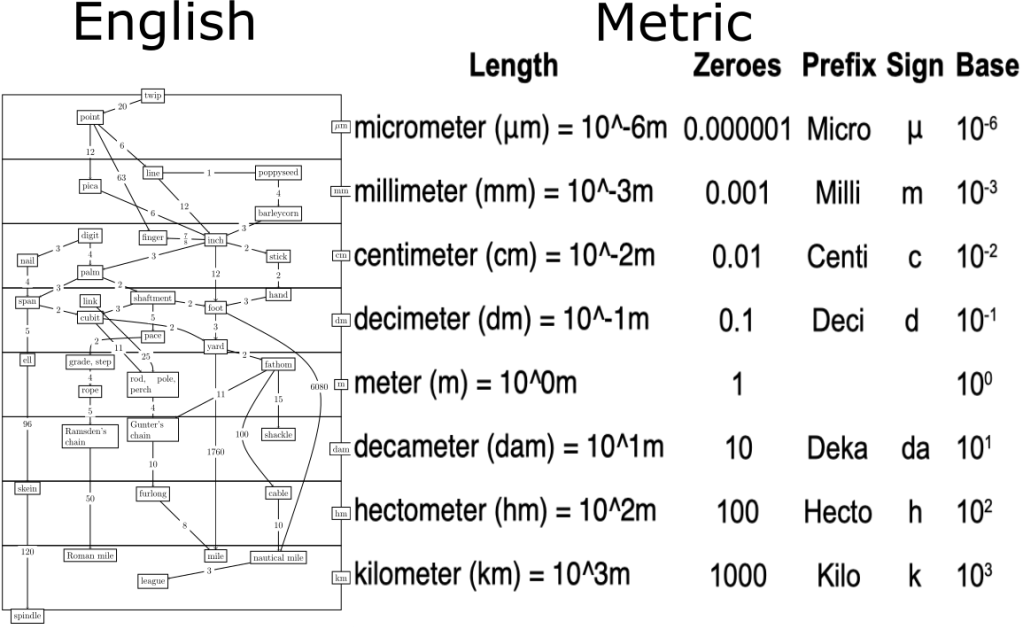 But a visual is better than thousands of words, and words of measures. Here is a side-by-side comparison of units of length in the traditional English system vs the metric one.