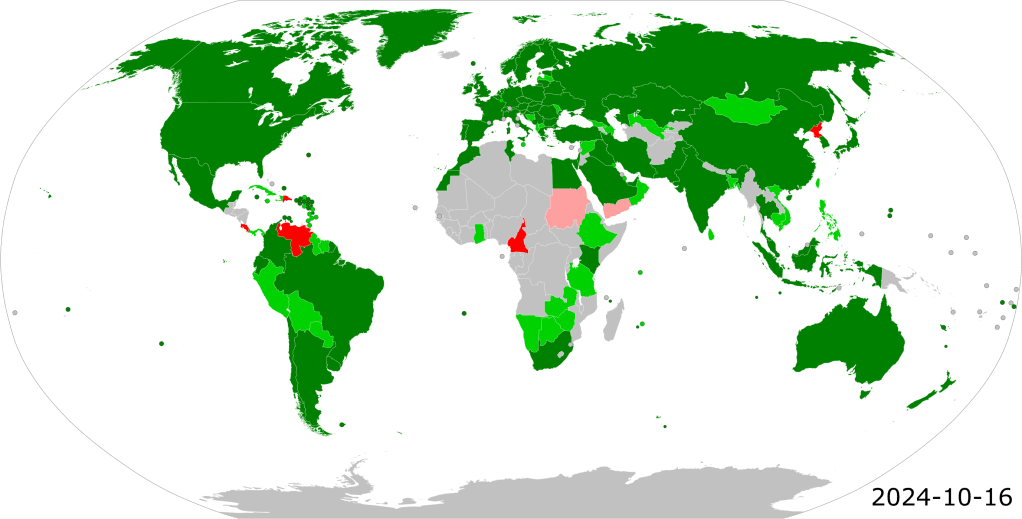 Metre Convention on the planet. Dark green, member states; light green, associate states; red, former member states; light red, former associate states.
