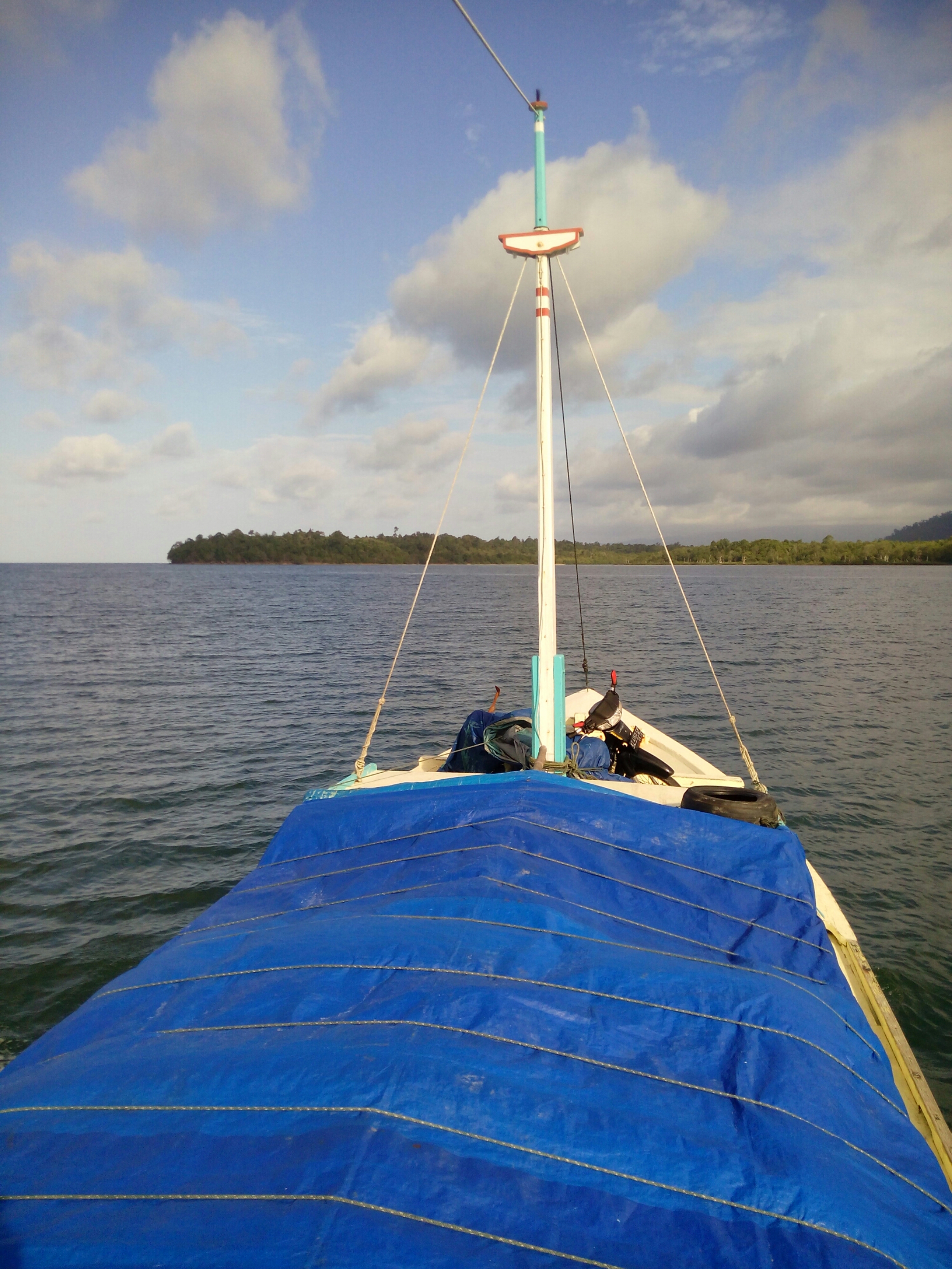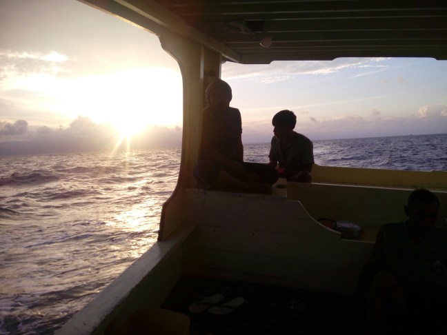 At some point close to midnight the diesel engine starts puling out much more exhaust into the vessel than what is normal. I go to the front part and enjoy the cloudy moon ride, it’s simply a fantastic scenery, no words. I get tired and since now the sea is almost flat I can easily and soundly sleep on top of the rice sacs of the front part, avoiding the flumes.